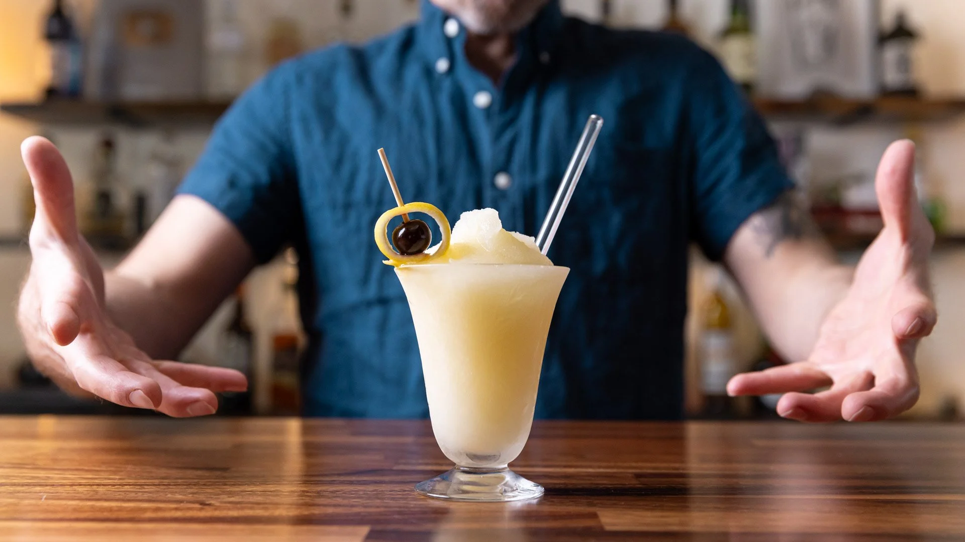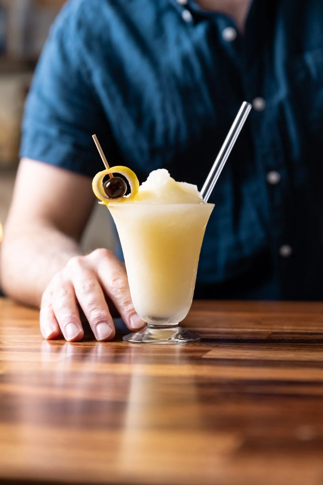 Today’s drink is the Saturn! This is a space age tiki drink that balances an assortment of tropical flavors. With two syrups and one liqueur, there’s plenty of sugar to hold up to the dilution of blending with crushed ice. Not everyone does this, but the result is an easy-to-drink frozen cocktail that’s perfect on a hot day! The Saturn is favorite of mine. Hope you enjoy it too! Cheers!